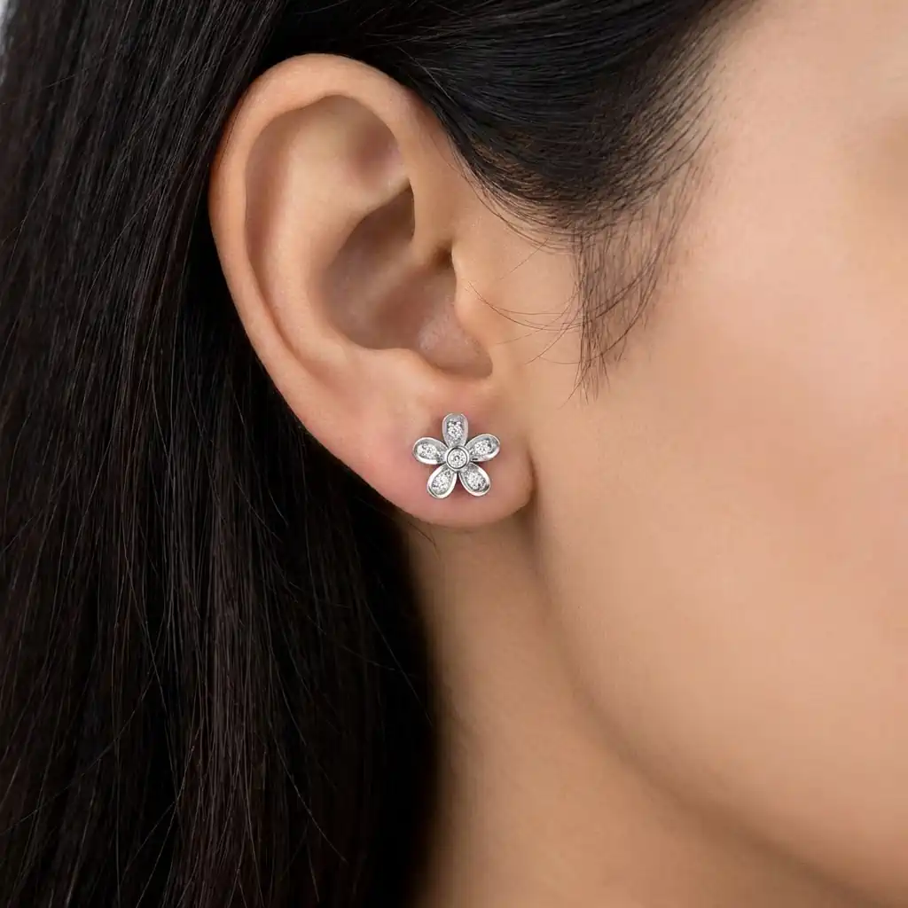 The floral silhouette frames the diamonds beautifully, giving the earrings a slightly more expressive look than a plain solitaire. Despite the shape, the design remains subtle and refined, making it suitable for everyday wear rather than special occasions only.