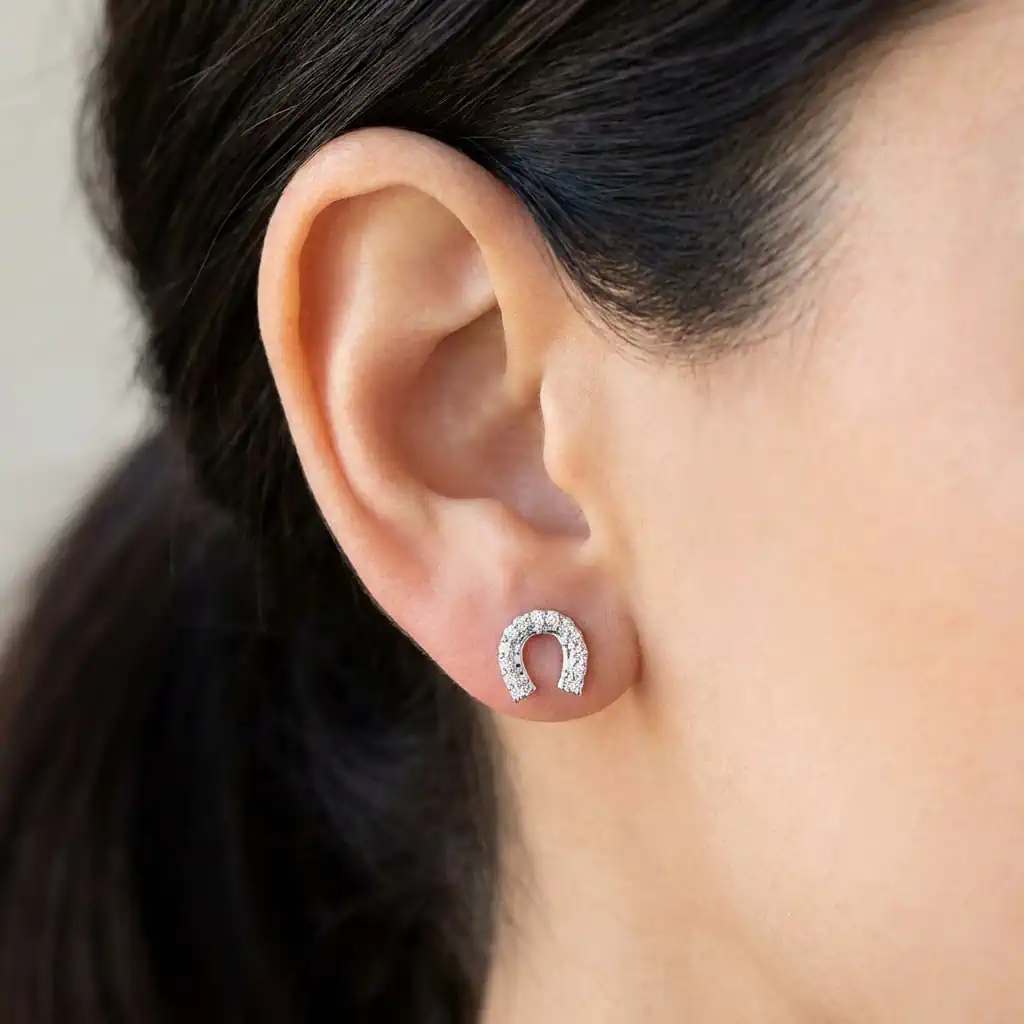 The horseshoe shape is small and refined, serving more as a quiet detail than a bold statement. It brings a sense of meaning and individuality while keeping the overall look clean and polished. From a distance, they still read as classic diamond studs.